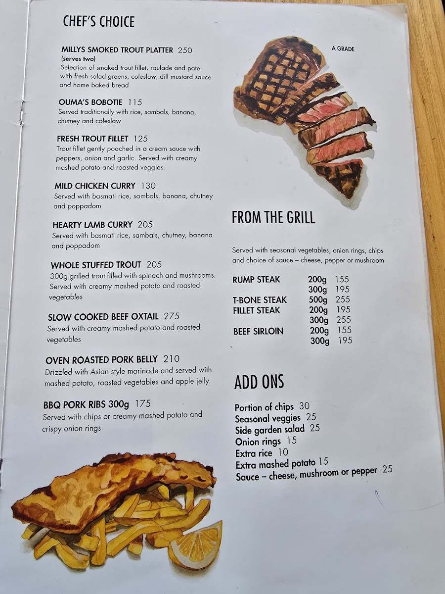 Welcome to The Café @ Millys, a culinary gem nestled by a serene dam in South Africa, offering a perfect escape for food enthusiasts and travelers alike. This café is celebrated for its warm ambiance and scenic views that complement an enticing menu. From hearty breakfasts to exquisite trout dishes and freshly baked pastries, every item is crafted with quality and flavor in mind.
